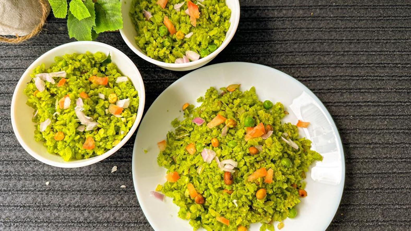 easy to make. All you need to do is prepare palak puree by steaming the palak and then blending it in a food processor. Mix it with poha and then temper it using mustard, jeera, and channa dal.