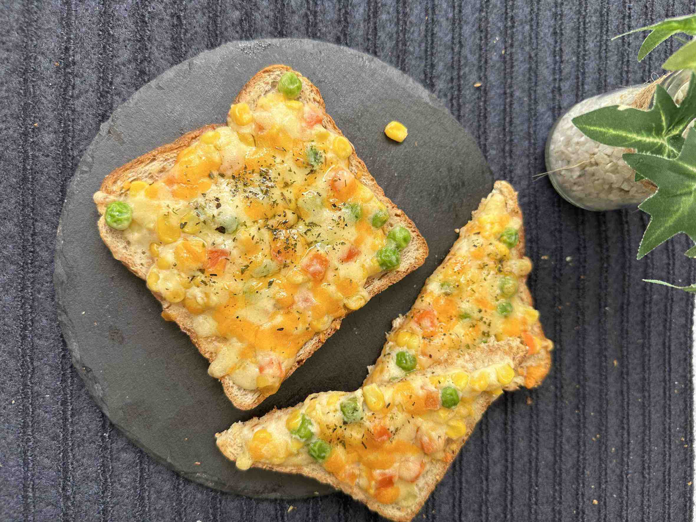 Vegetable cheese toast is a perfect for lunch box, snack and as light evening dinner. It can also be served with some milkshakes for your kids birthday party or play dates.